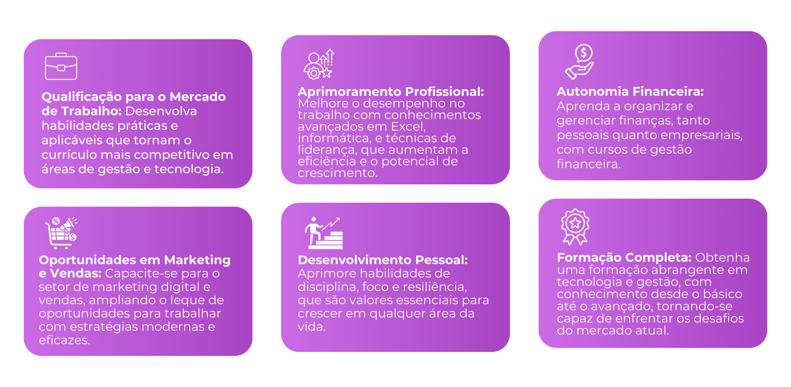 Oferecemos cursos de informática, Excel do básico ao avançado, gestão financeira, liderança, assistente administrativo, marketing e vendas, focados no aprimoramento profissional e pessoal nas áreas de gestão e tecnologia.